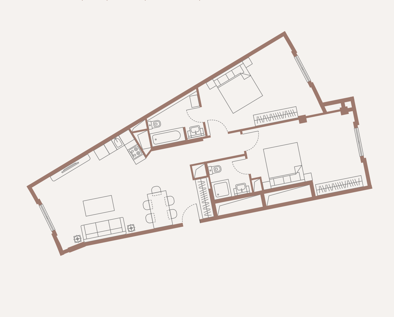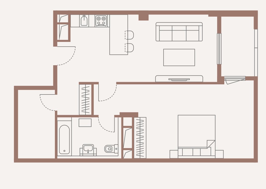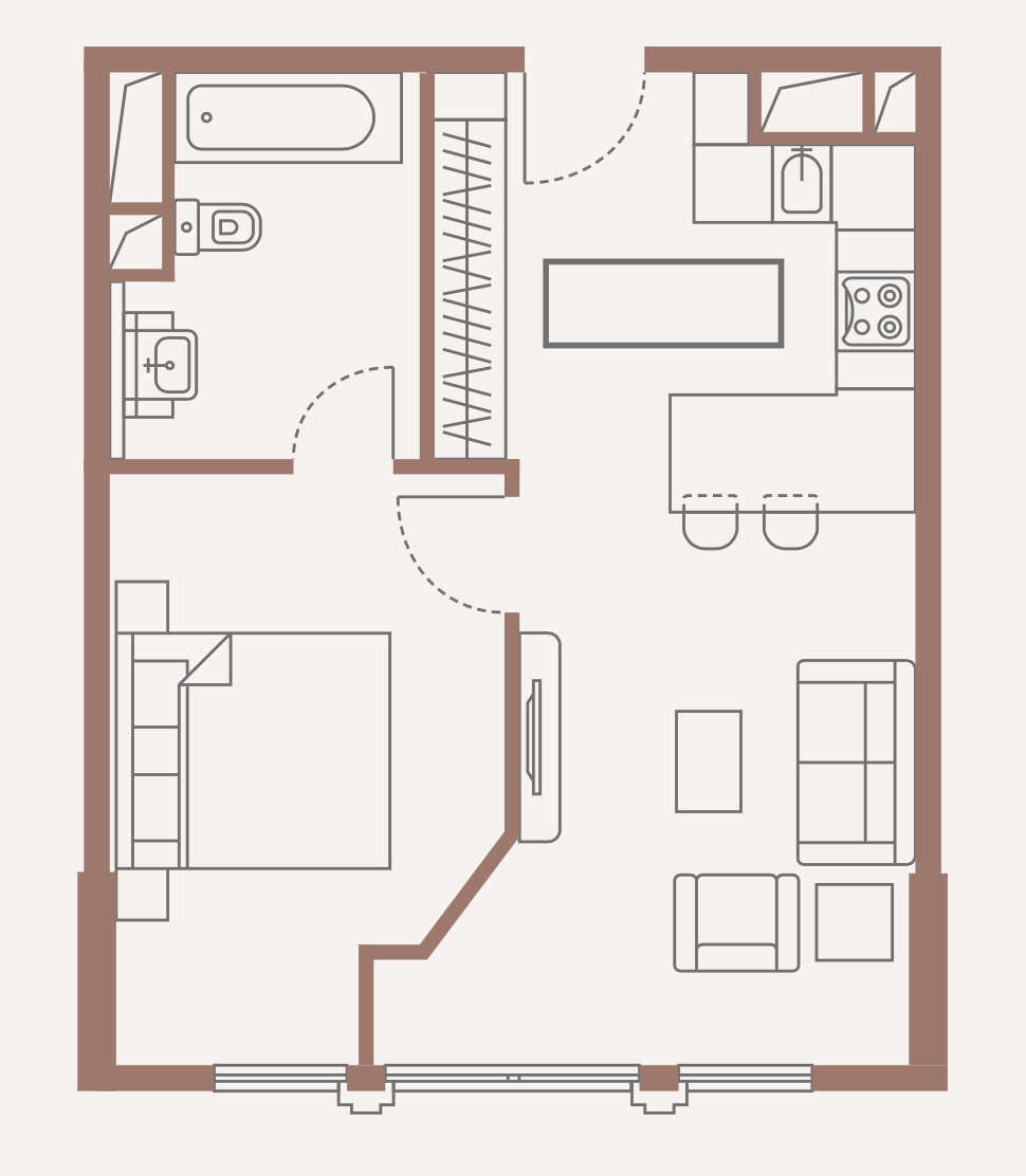 В комплексе представлены 2 типа резиденций: 1. С кухней-гостиной и одной спальней 2. С кухней-гостиной и двумя спальнями